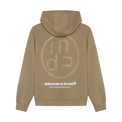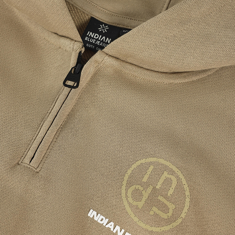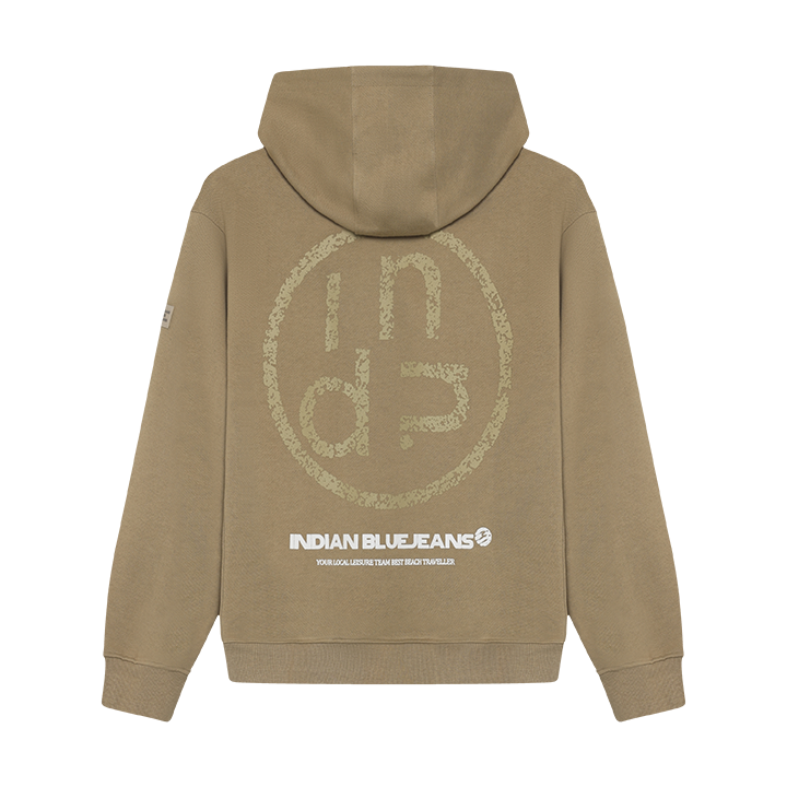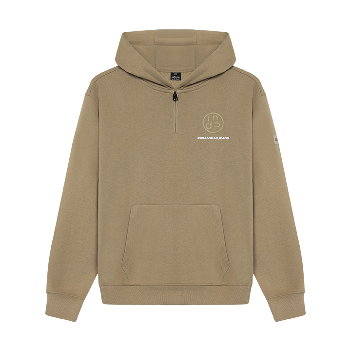 Layer up in the Sand Storm Loose Fit Hoodie Zip — zipper neck, subtle chest print, sleeve patch, and bold backprint for laid-back style.
