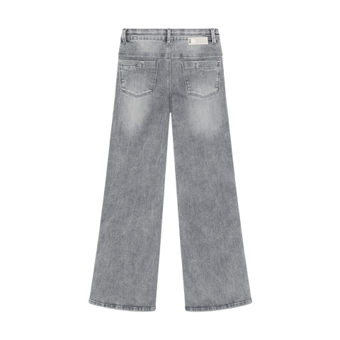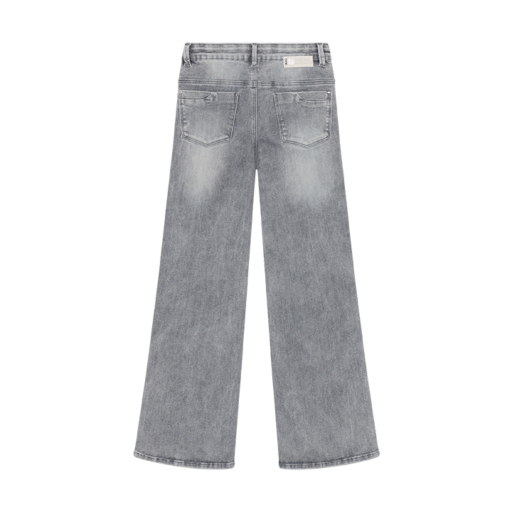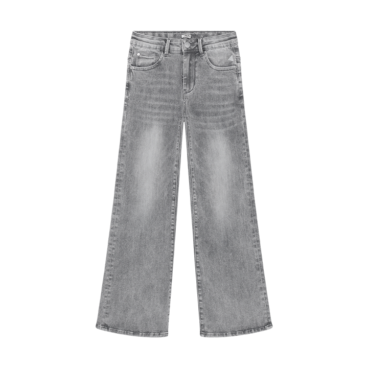 Details: Wide fit, light grey denim, 5-pocket design, fitted on hip, wide at knee and ankle, button/zip closure at center front, adjustable waistband