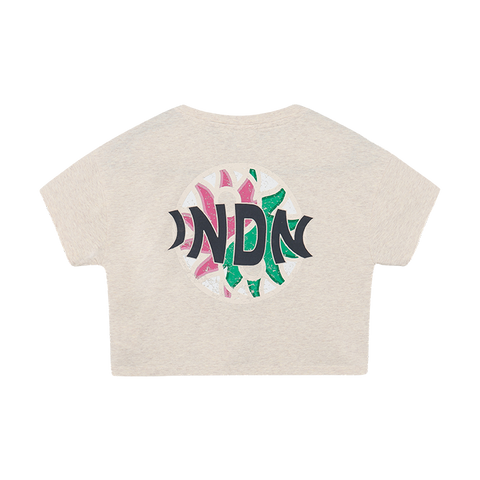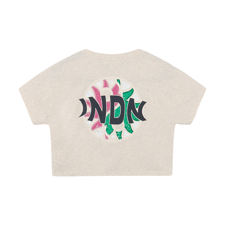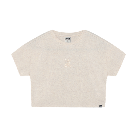 This cropped T-shirt in Light Sand Melange features a bold back artwork and a subtle front print. Its relaxed fit makes it easy to combine with jeans, skirts, or shorts for school and weekend outfits. Small matching chest embroidery and short sleeves complete the playful and comfortable design.